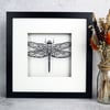 A fabulous and intricate Dragonfly design, papercut into black card and mounted in a black box frame. This design really highlights the intricacy of the Dragonflies wings, and will look great in any contemporary home.