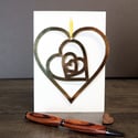 The heart keepsake can be ordered in either a 3mm wood, which has a lovely soft feel to it, or a gold and silver mirrorcard. Both look great when hung and can be sent out on a red, black, kraft brown or white A5 card.