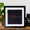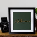 Each piece is individually cut and mounted on to a dark green backing mount and framed up in one of our eco-friendly black box frames. These pieces can be hung or stood using the stand on the reat